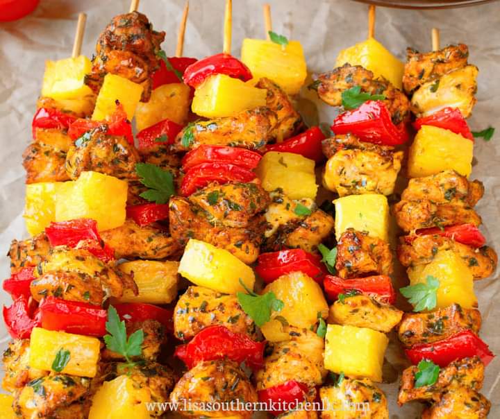 These chicken kabobs are made with grilled chicken and pineapple, red peppers on skewers.