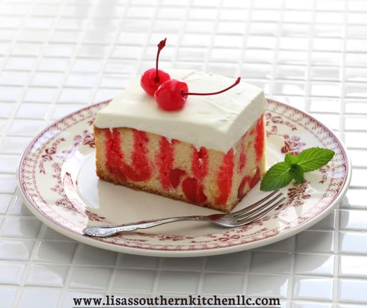 Cherry Poke Cake is white cake and poke holes in the cake, pour cherry gelatin on top in the holes.