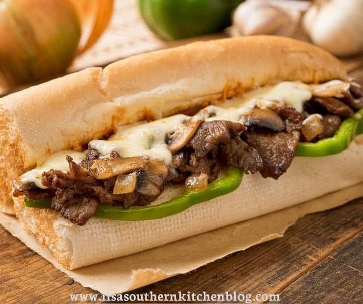 A philly steak sandwich made from thinly sliced pieces of beefsteak and melted cheese in a long hoagie roll.