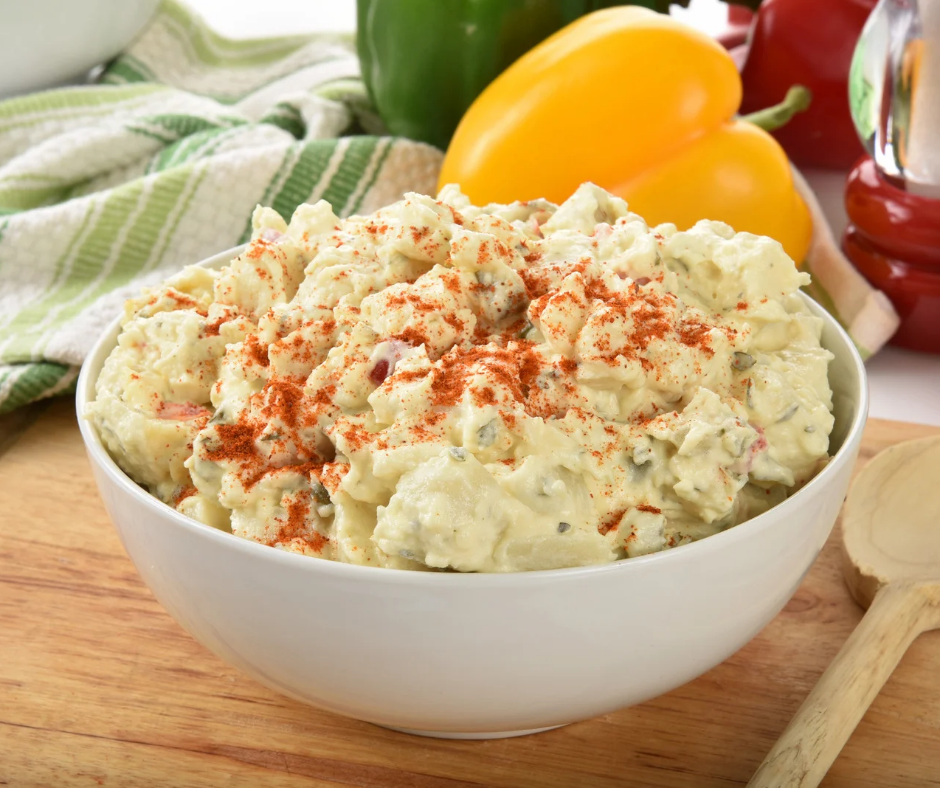 Potato salad is made of boiled potatoes and boiled eggs, onion, bell peppers, mayonnaise and mustard, salt, black pepper to taste.