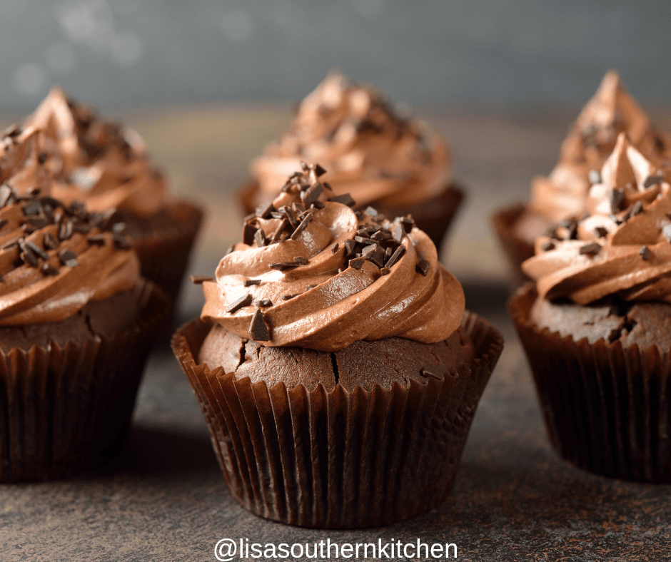 Frost each cupcake with chocolate frosting and garnish with chocolate. Serve