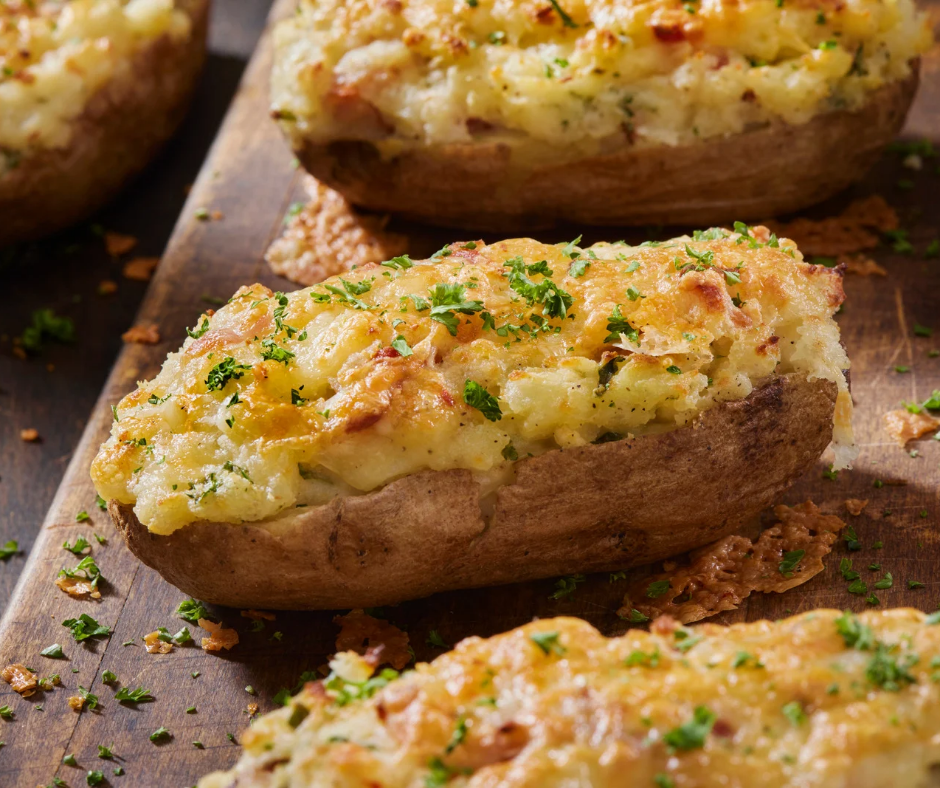 Place potato on baking sheet cook for 1 hour 30 minutes. Take baked potatoes out of the oven and add topping of cooked bacon and cheese. Place potatoes back in the oven and bake for 15 minutes until cheese is melted. Let it cool for 10 minutes before serving.