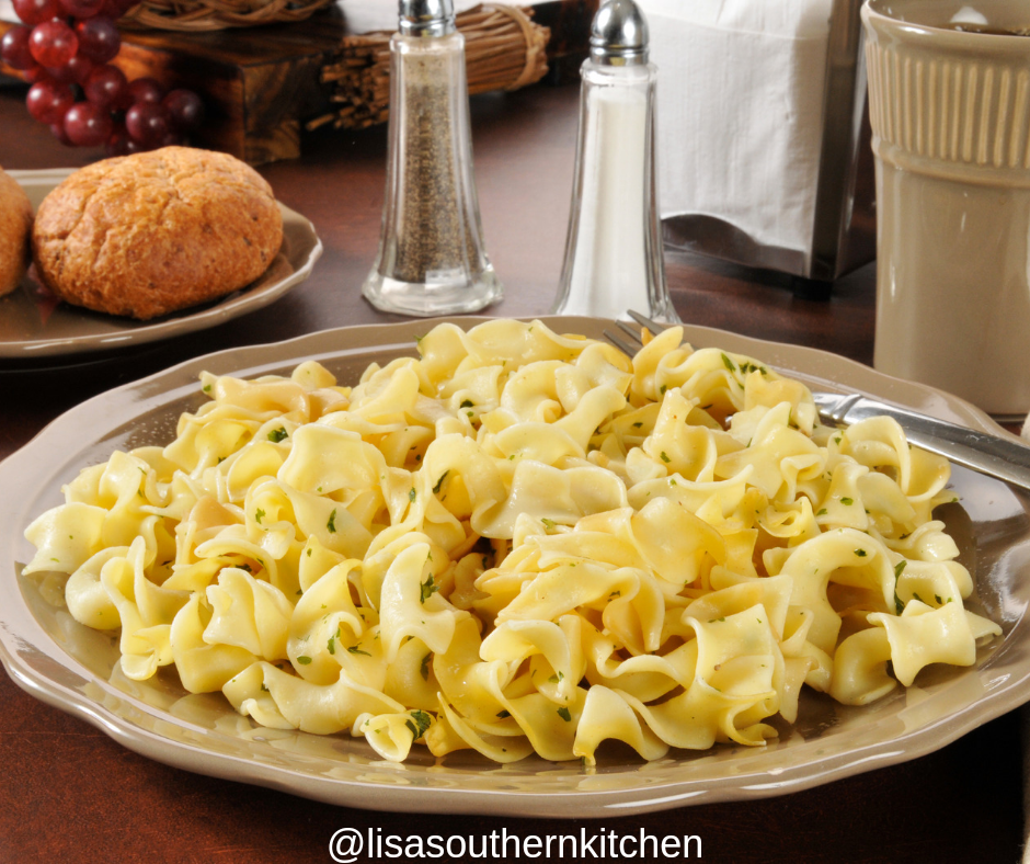 The buttered noodles are made of noodles, butter, lemon juice, garlic powder, parmesan cheese and salt, black pepper all needed for easy dish.