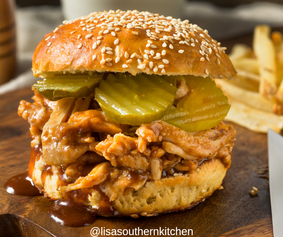 Take the buns and make with shredded BBQ chicken, add pickles.