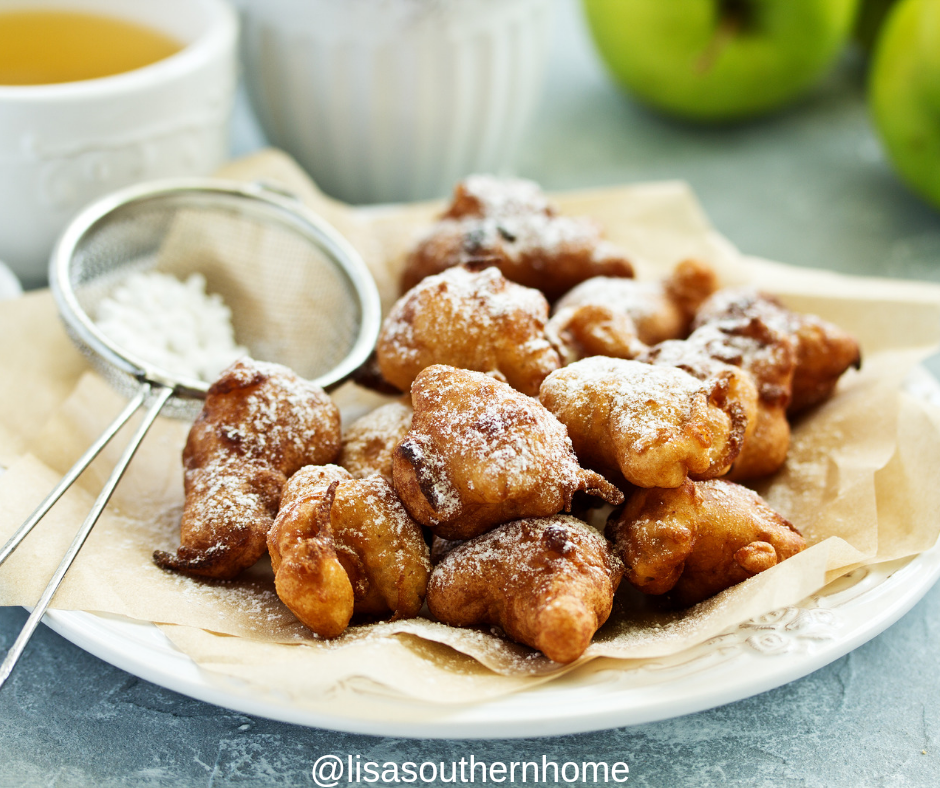 Place the fried apple fritters on paperlined plate to drain off excess grease and then place them on platter.