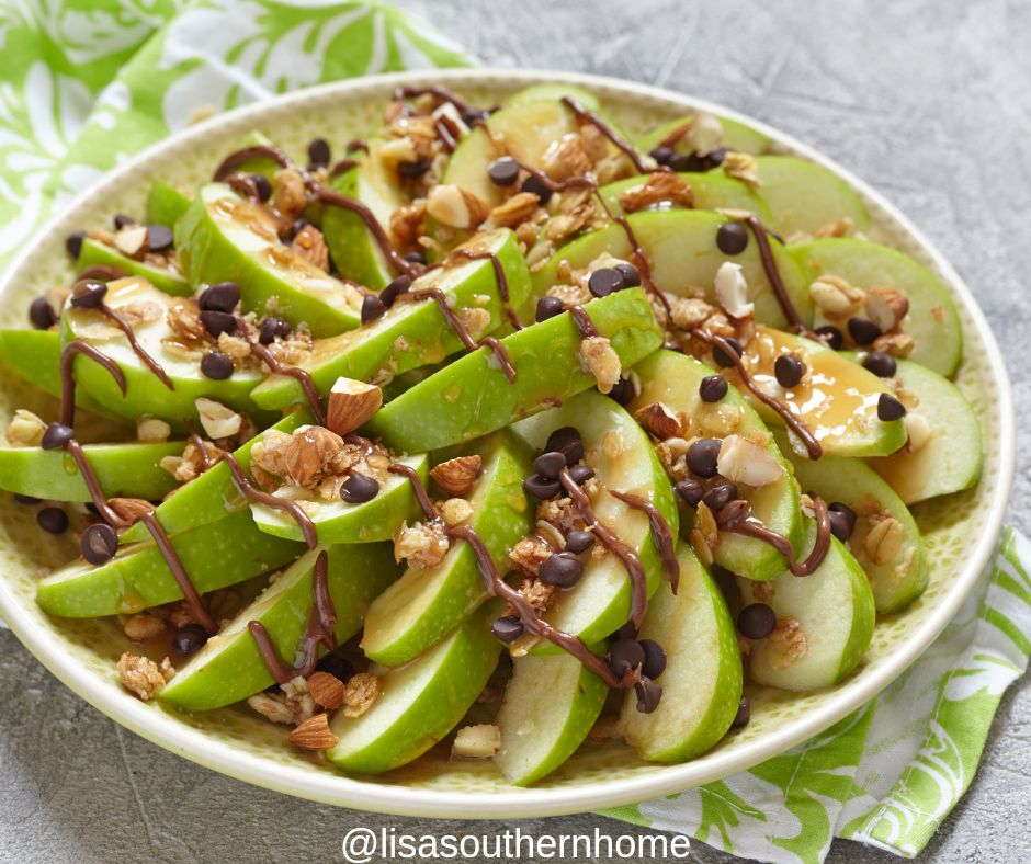 On a serving platter, layer the apple slices, pour caramel sauce, chocolate sauce and candy bars, chocolate chips. Keep in the