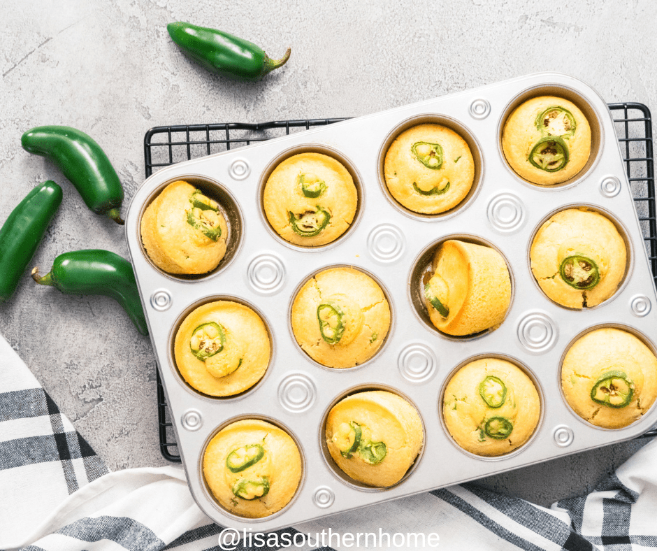 The jalapeno cornbread muffins are made with jalapeno, cornbread, flour and buttermilk milk, sugar, salt
