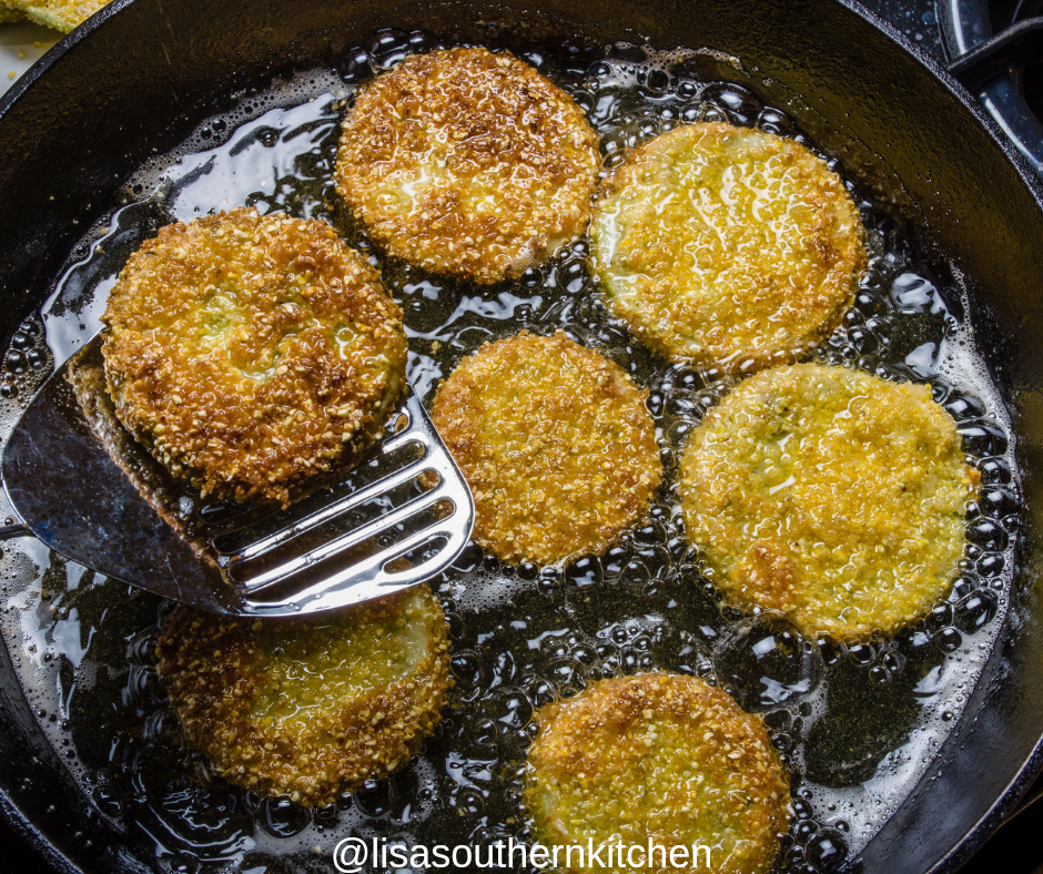 • Place the breaded green tomatoes in a hot oil cast iron skillet and cook on both sides until crispy, golden brown.