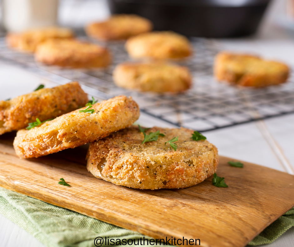 Fried green tomatoes are coated with cornmeal, flour breading is a crispy golden brown.