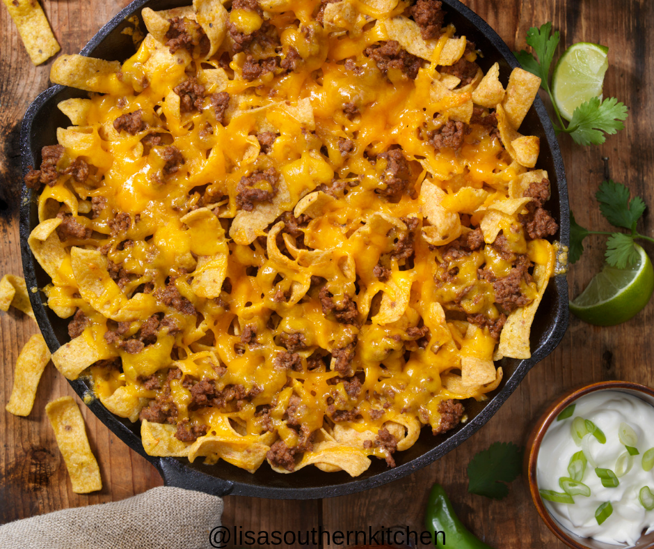 • In baking dish, place beef mixture bottom of the dish and pour corn chips topped with cheese.