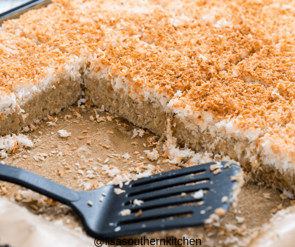 For the frosting, mix frosting and toasted coconut together and spread on sheet cake.