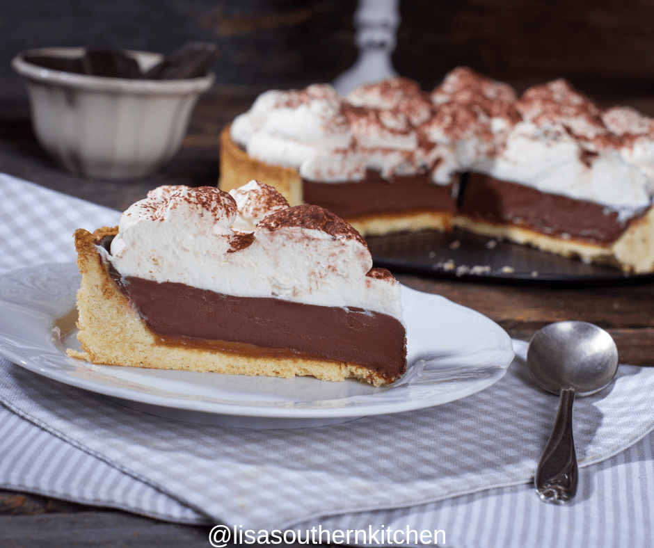 The chocolate pie is so easy to make with chocolate pie filling in a crust topped with cool whip. topping.
