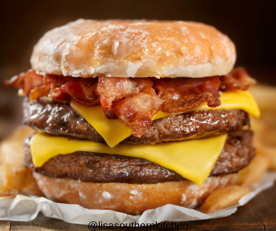 Cut the glaze donut in half and lay bottom on plate add one cheese patty down, lay second one on it and add the crispy bacon on top. Place the dough on top. Enjoy!
