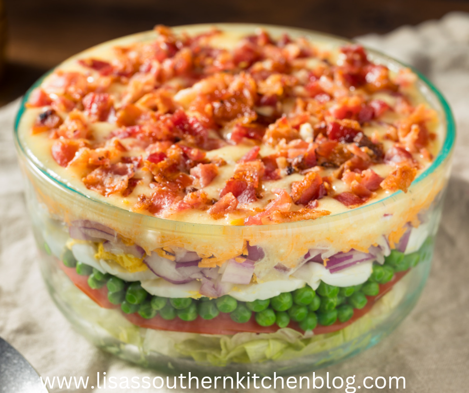 Pour mayonnaise/sugar mixture on top and sprinkle cheese, add bacon.