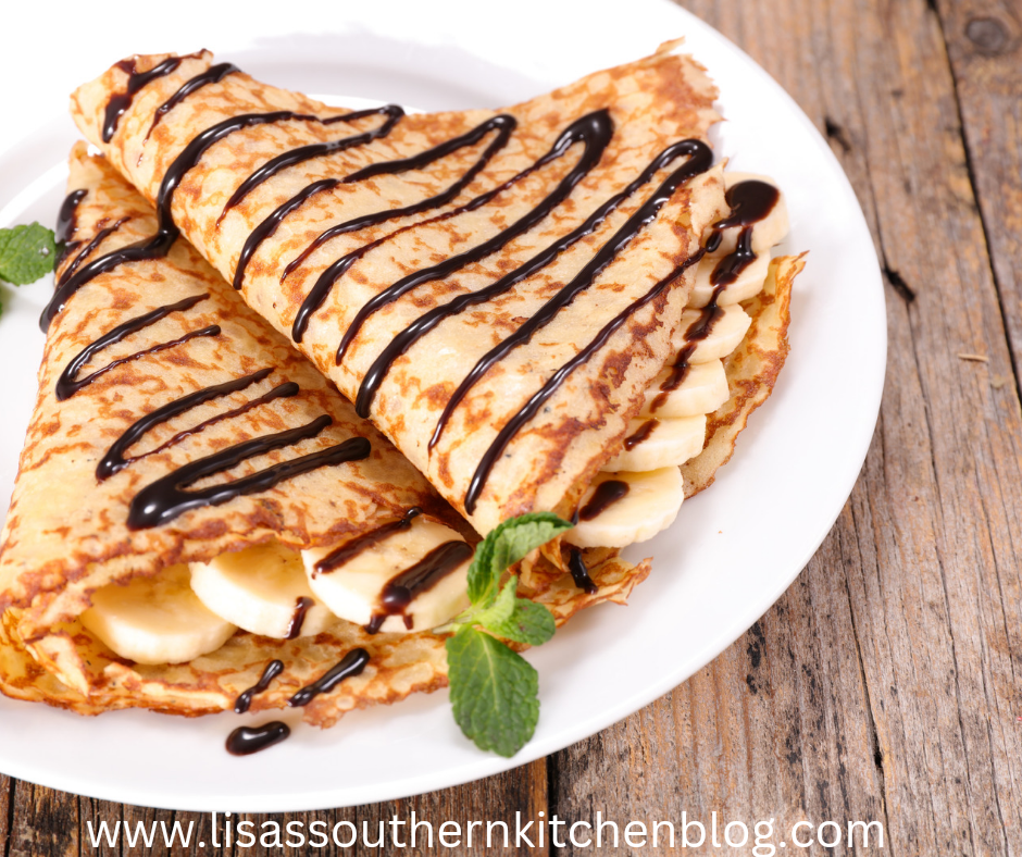 Place crepes on flat surface and add sliced bananas, close the crepes up and drizzle chocolate syrup on top of the crepes.