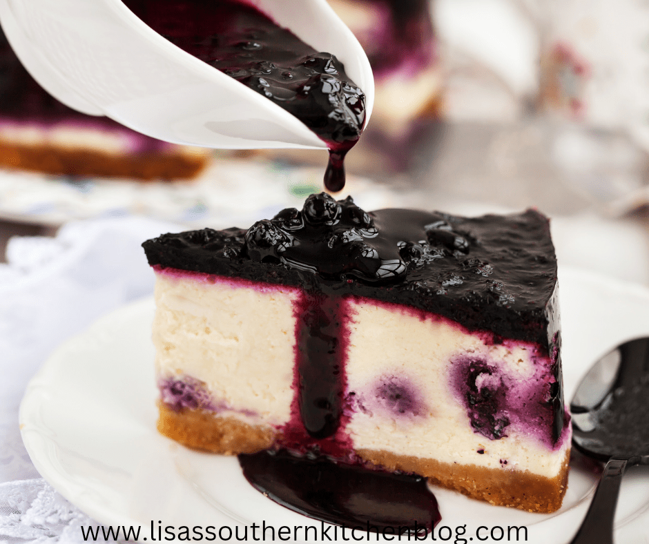 Pour the blueberry sauce over the cheesecake.