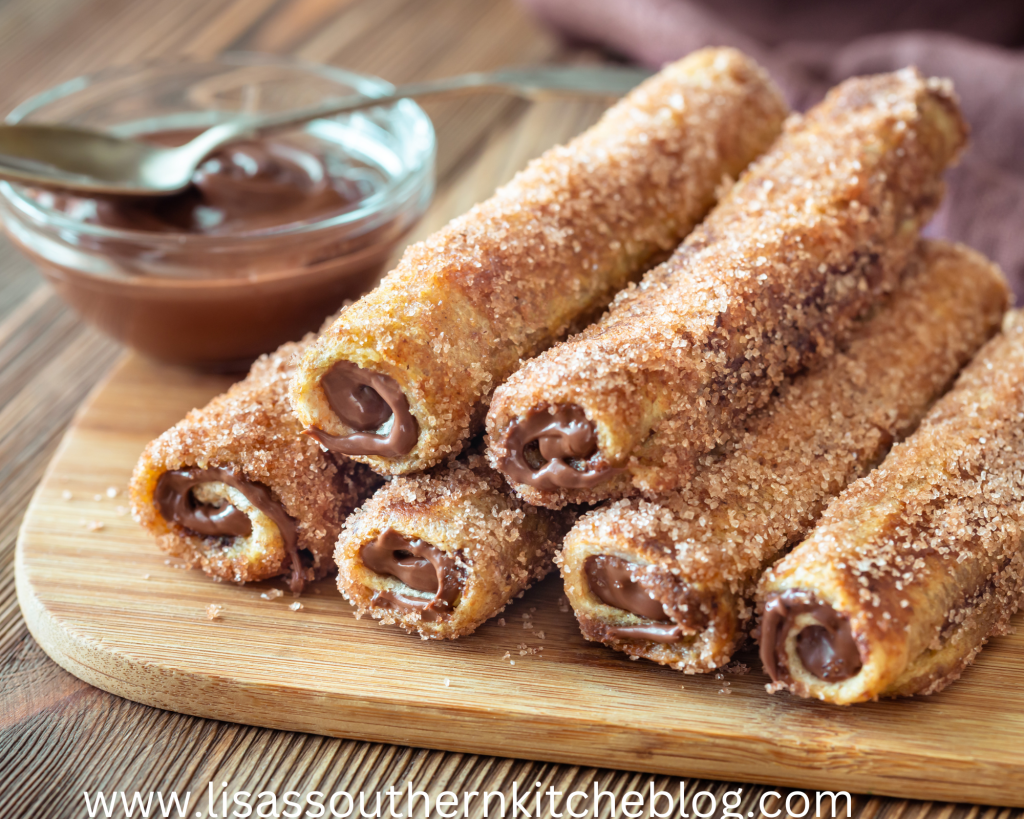 First is take the 6 Slices of bread and cut the crust at the edges and lay on surface, roll each bread out with rolling pin. Nutella in each slice bread and roll it up.