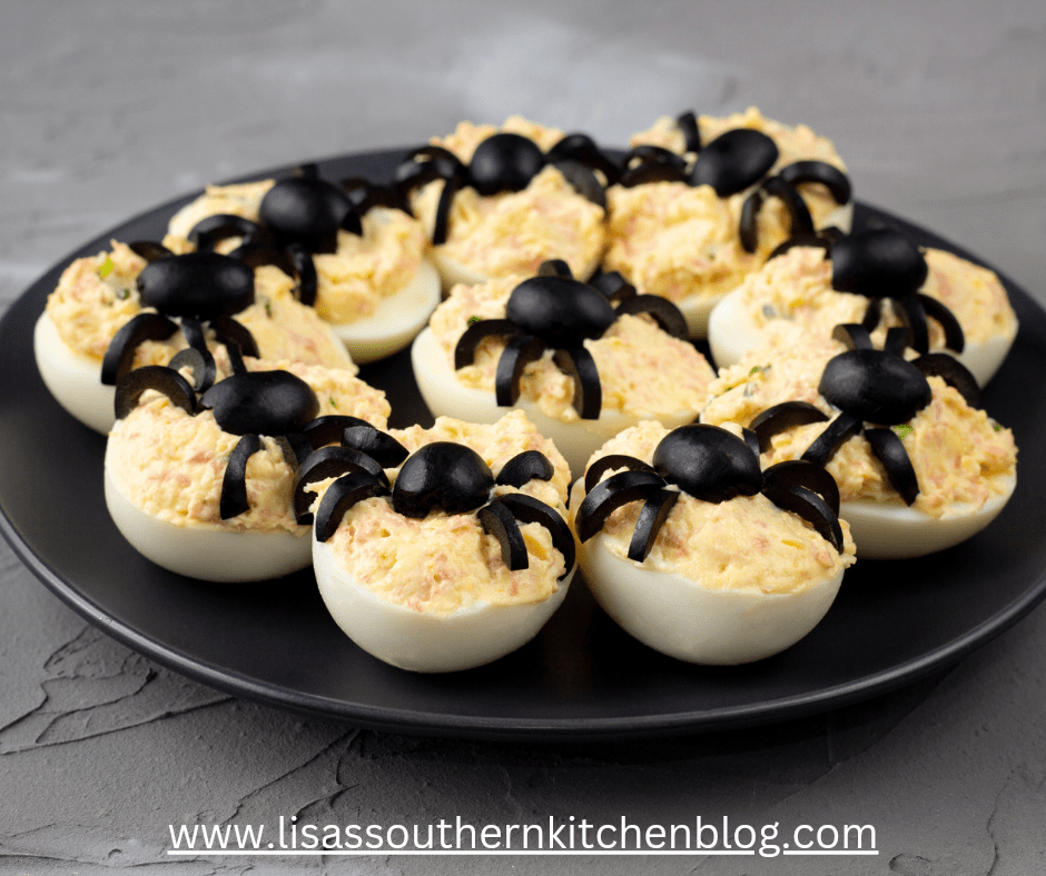 Slice the olives in half, place on the egg yolks mixture, cut the legs out of the olives and place looking like spider. Keep in the fridge ready to serve.