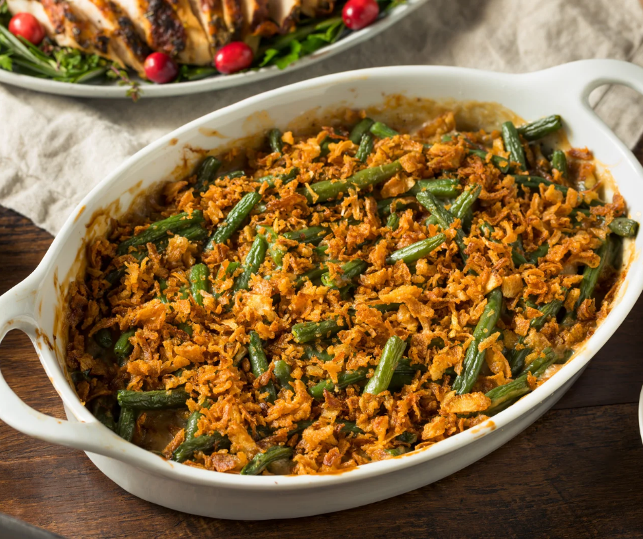 Pour the mixture into a greased baking dish and sprinkle French-Fried Onions and remaining cheese on top.