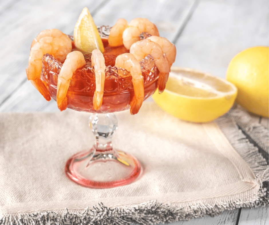Pour the tall coglass and add the shrimp around the edges of wine glass. Squeeze lemon juice over top of shrimp and