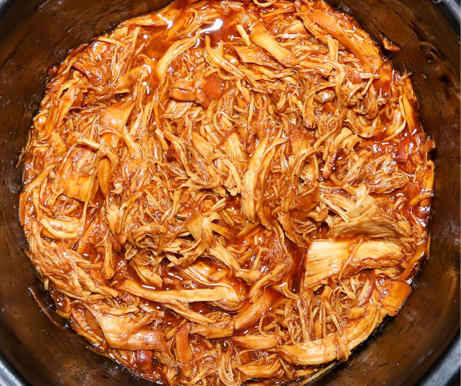 Pour the bbq sauce over the chicken breast and cook for 8 hours and then take a fork to shred the chicken and stir to coat the chicken in the bbq sauce. Serve.