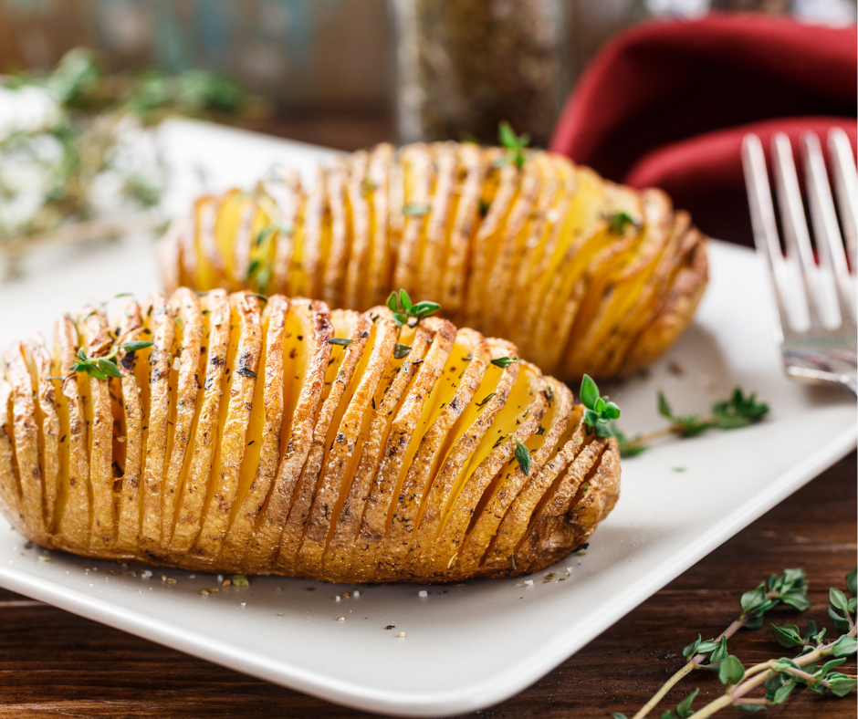 Place the potatoes on cutting board and use a sharp knife to sliced 1/4 inch apart to make slits in the potatoes.