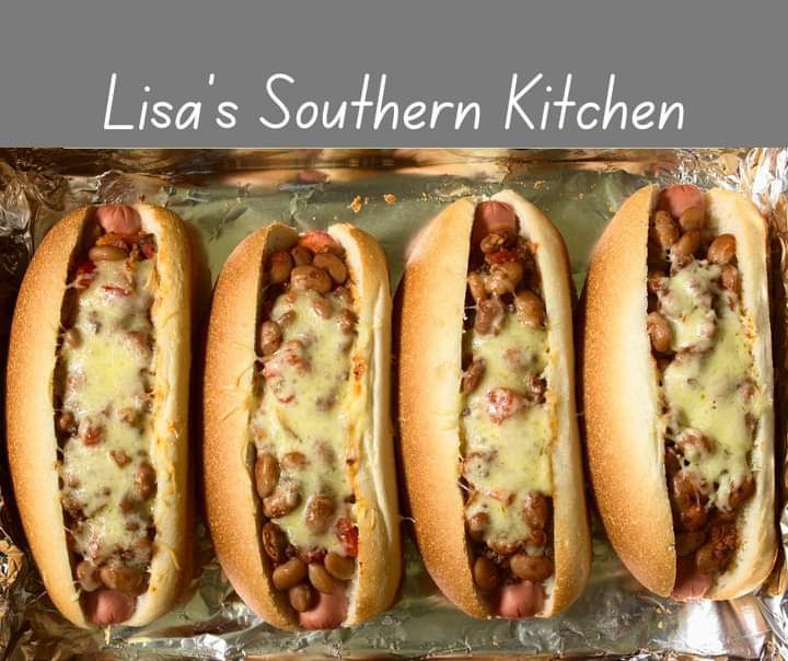 - Place 4 Hot dog buns on tin foil baking pan and then hot dogs inside the and spoon chili sauce over the hot dogs, sprinkle cheese on top.