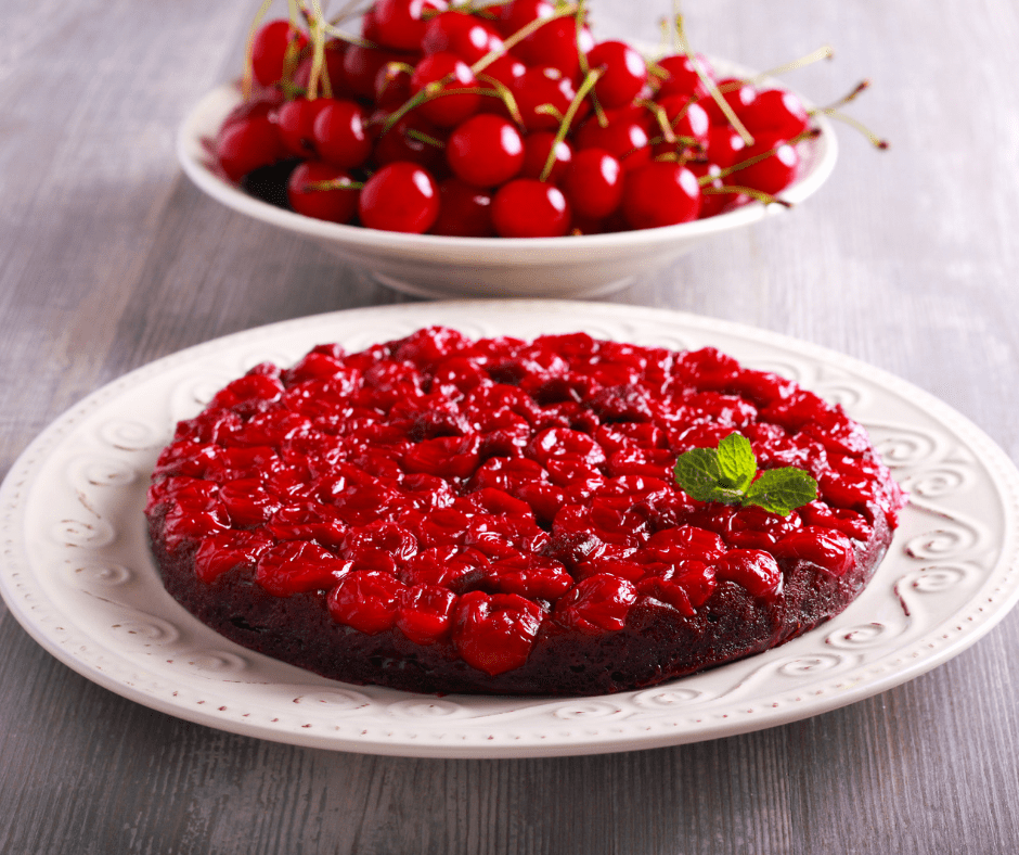 6. Turn the cake over on a serving plate that cherry pie filling is showing upright.