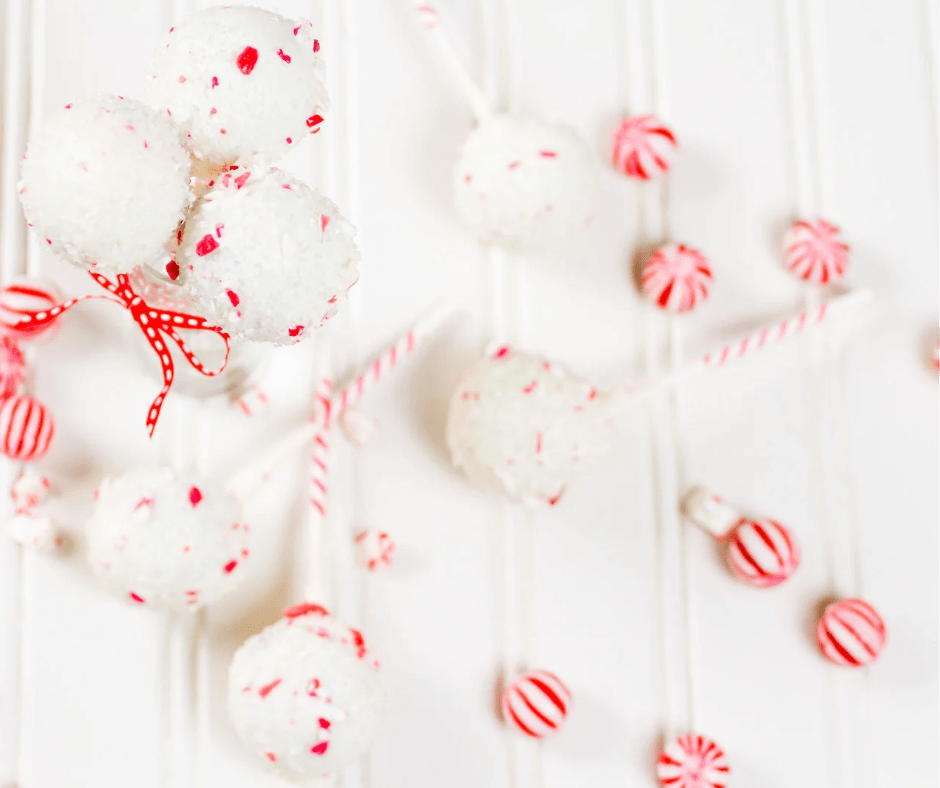 - Take the cake balls out of fridge and insert lollipop stick in each one. Then dip cake pops in melted white chocolate and sprinkle with crushed peppermint candies.