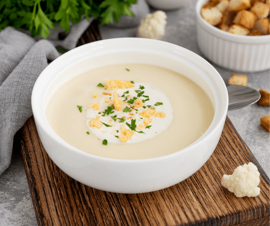 - In a crockpot, add in cauliflower and garlic, chicken broth, cover with lid and let it cook for 8 hours on low.