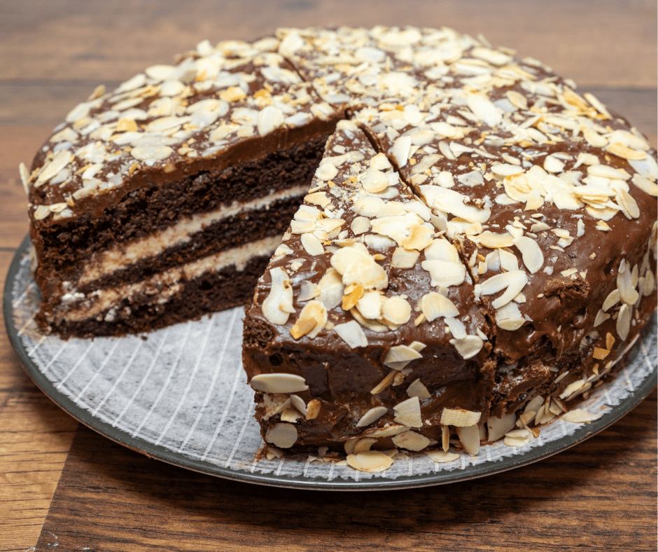 - In a bowl of stand mixer, add in butter, chocolate, coffee, beat well. Stir in toasted almonds and mix well until combined.