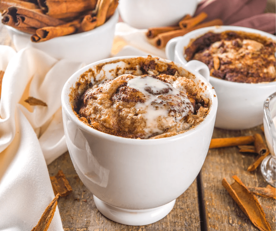 - Pour the glaze over the warm cinnamon roll in the mug.