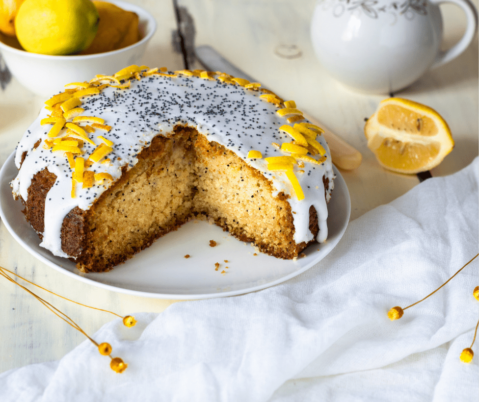 - Pour the glaze over the cake and garnish with grated lemon zest.