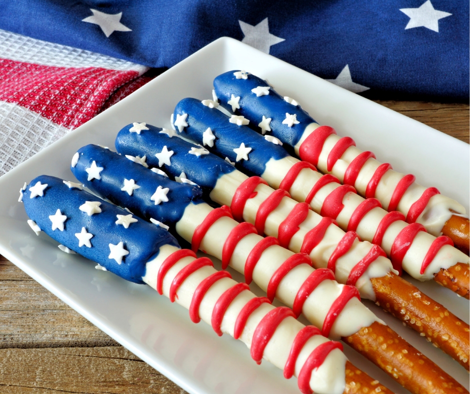 - Dip the pretzel rods in the white candy melts half way on the pretzel rods and roll to coated and then drizzle red candy melts around the white candy melts.