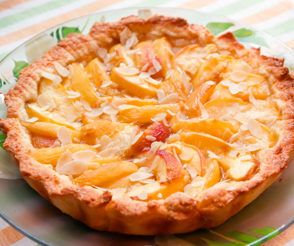 - Take pie tart crust out of the freezer and pour in the peach filling.