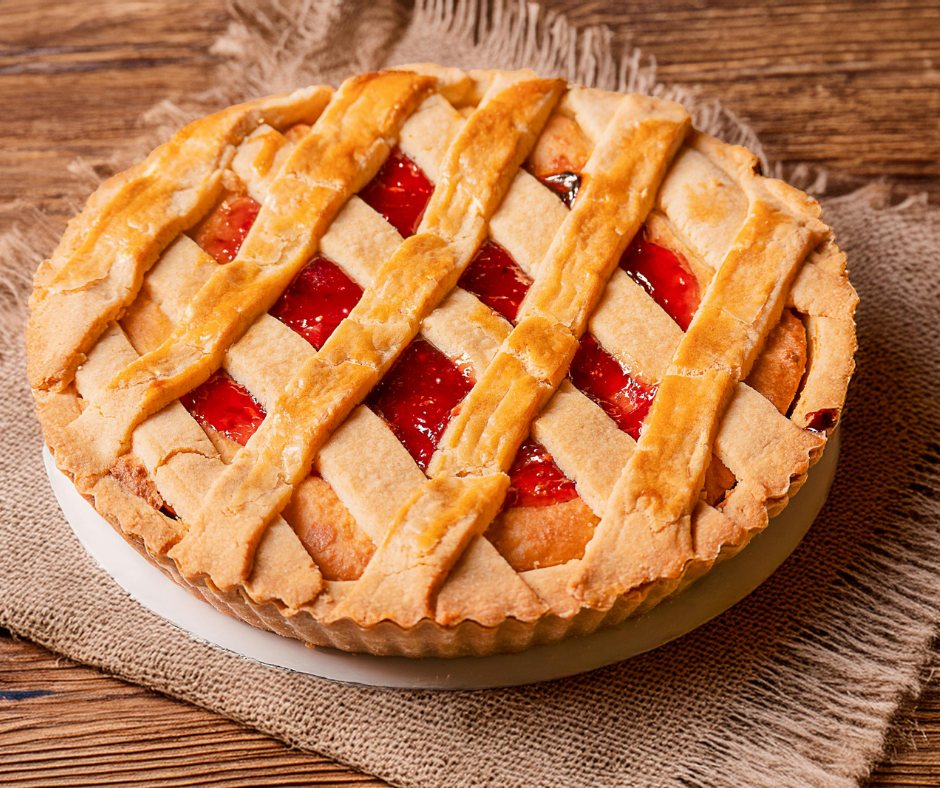 - Now place second pie crust into a cutting board and use a knife or pizza cutter to cut pie crust into stripes. Place those stripes on top of strawberries filling.