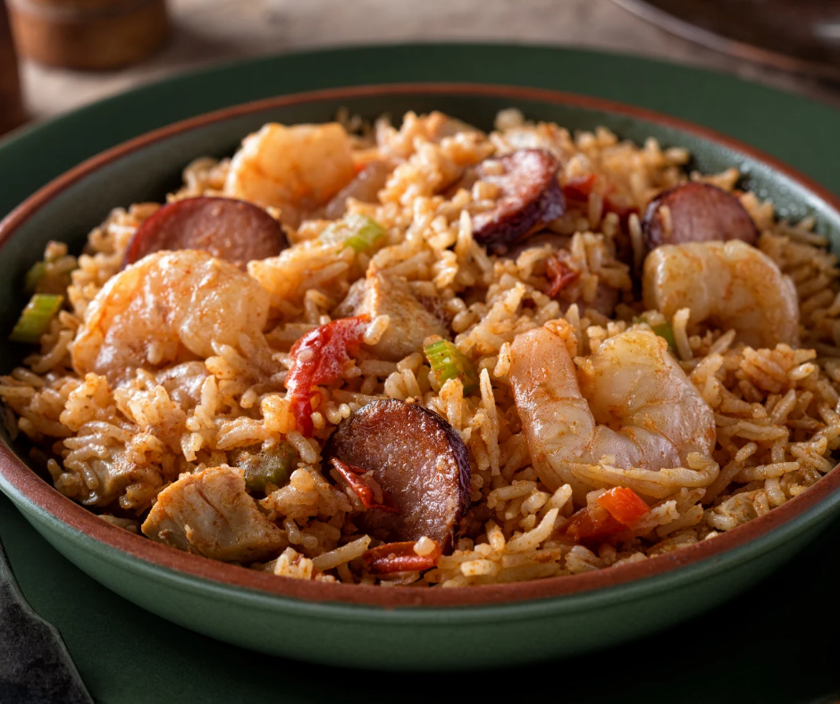 - In a bowl add in cooked white rice and then pour jambalaya over top. Serve warm.