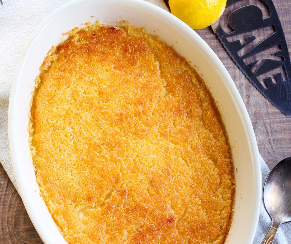- Pour lemon pudding mixture into the greased baking dish and bake for 35 minutes until light golden brown.