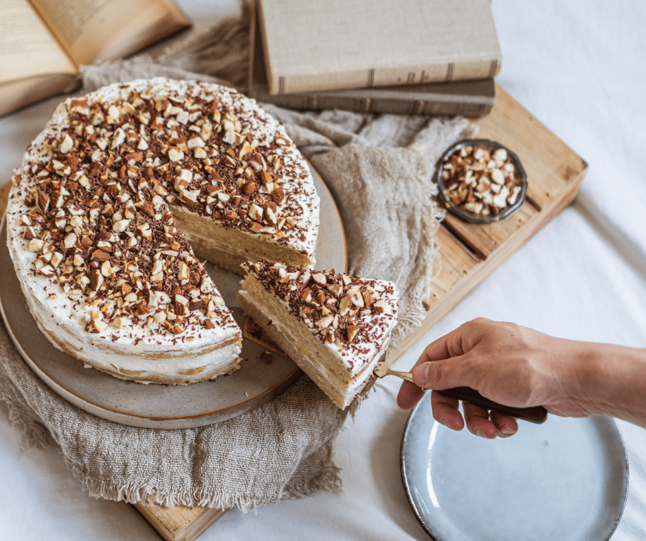 - Lay one cake layer on a cake plate frost it, sprinkle with chopped almonds and then lay second layer on top, frost it and garnish with remaining chopped almonds. Slice and serve.
