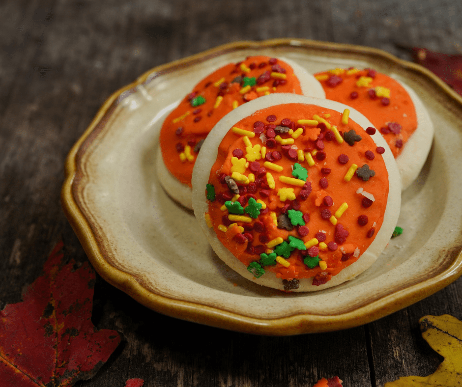 - Frost each cookie with orange frosting and garnish with sprinkles.