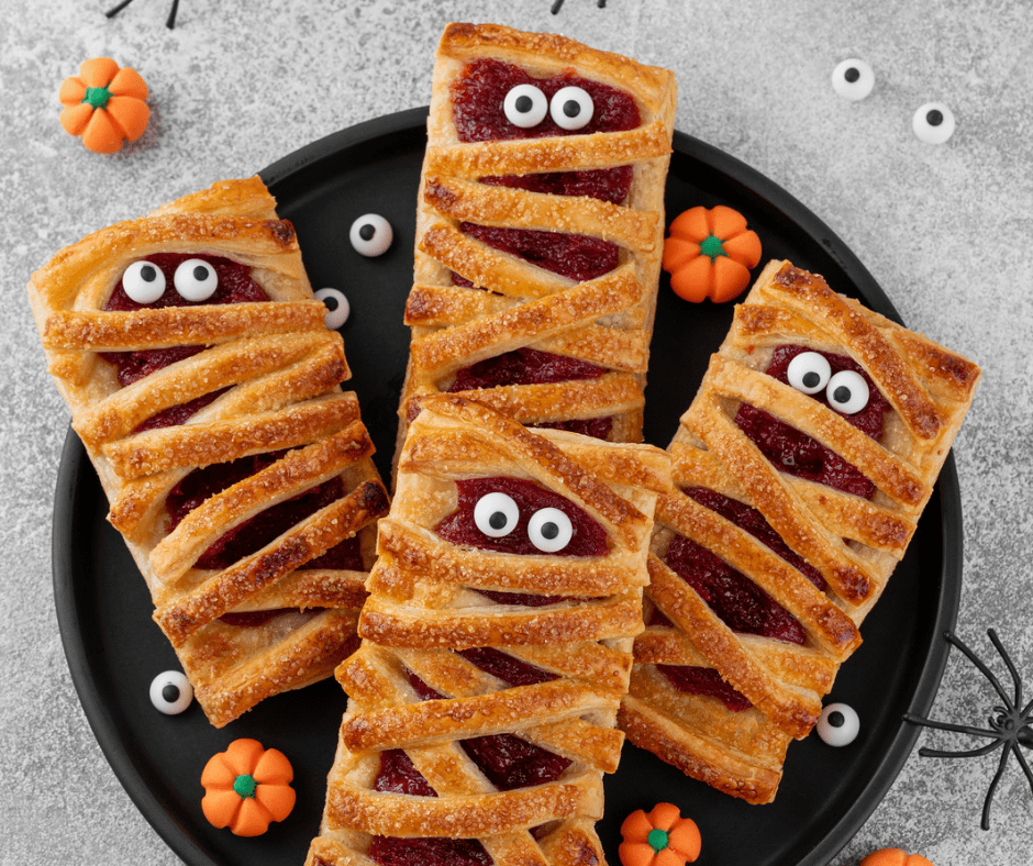 - Spoon the raspberry jam into rectangle puff pastry and add strips on top. Place edible eyes top of the puff pastry.