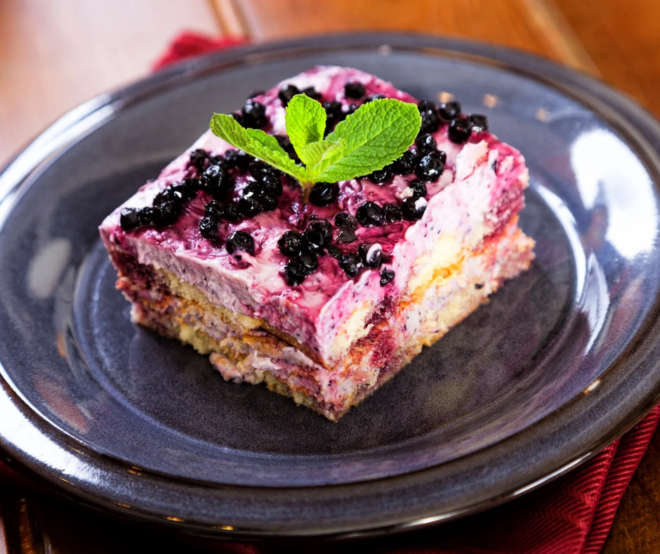 - Spread evenly heavy cream mixture over ladyfingers and then layer more ladyfingers and then add mashed blueberries.