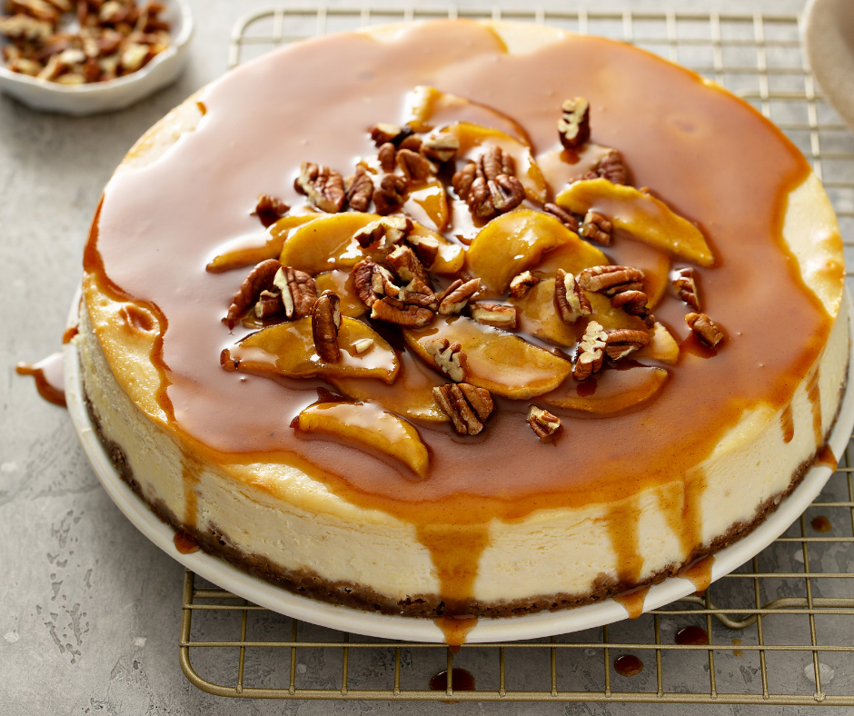 - Pour the caramel sauce over the cheesecake and then pour apple filling on top.