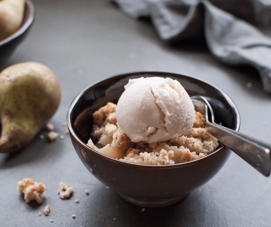 - Pour the crumble topping over top of pear filling evenly spreading out.