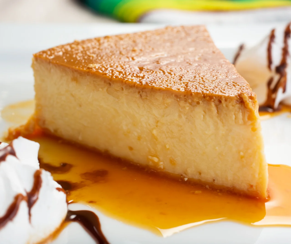 - Take the flan cake out of the fridge and spoonful caramel sauce over top.