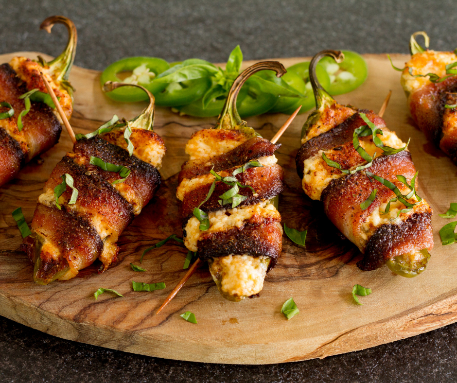 - Fill each jalapeno with cream cheese mixture and then wrap with slice of bacon.