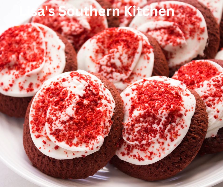 - Spread the frosting on each cookies and sprinkles top with red velvet cake crumbs.