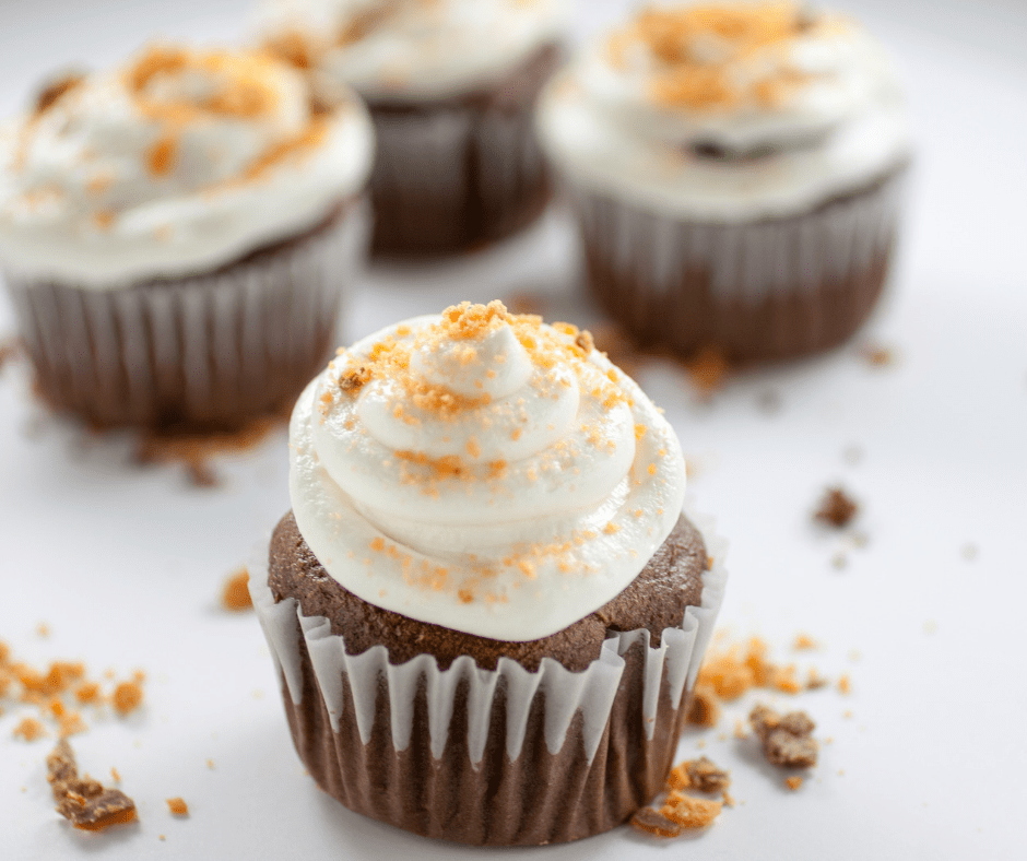 - Spoon the frosting in pipe bag and pipe on the cupcakes, garnish with chopped butterfinger candies.